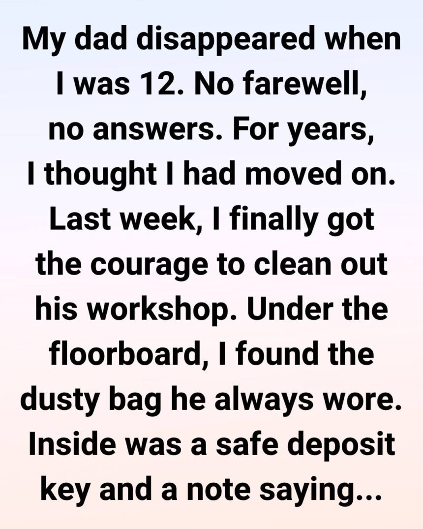 Beneath the loose plank was a small, dusty bag—the same one Dad used to carry everywhere. My hands trembled as I unzipped it. Inside was a small safe deposit key and a folded piece of paper.
