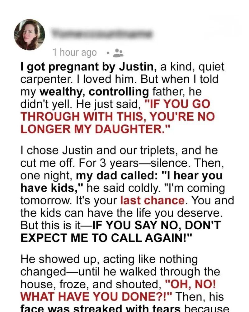 I chose Justin and our triplets, and he cut me off. For 3 years—silence. Then, one night, my dad called: “I hear you have kids,” he said coldly.