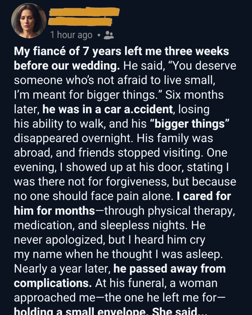 He said it with a confidence that made me feel tiny, like our life together had been just a stepping stone he’d outgrown. I remember standing there, my wedding dress still at the tailor, invitations already mailed, wondering how someone who once traced constellations on my back could suddenly walk away like I was a mistake he needed to correct.