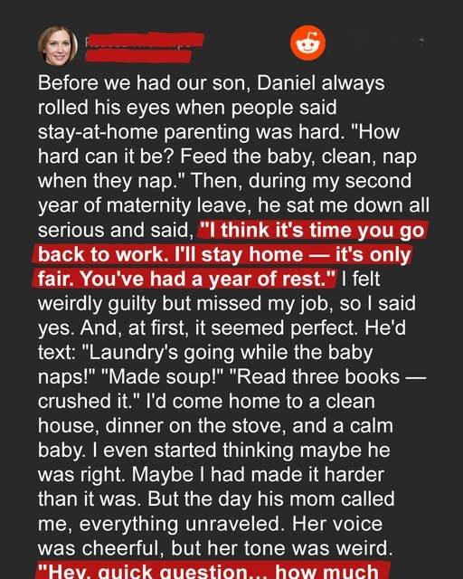 When Daniel offered to stay home with our newborn so I could return to work, I felt lucky—grateful, even. Each day came with clean counters, warm meals, and adorable photo updates. He wore the “Superdad” badge proudly.