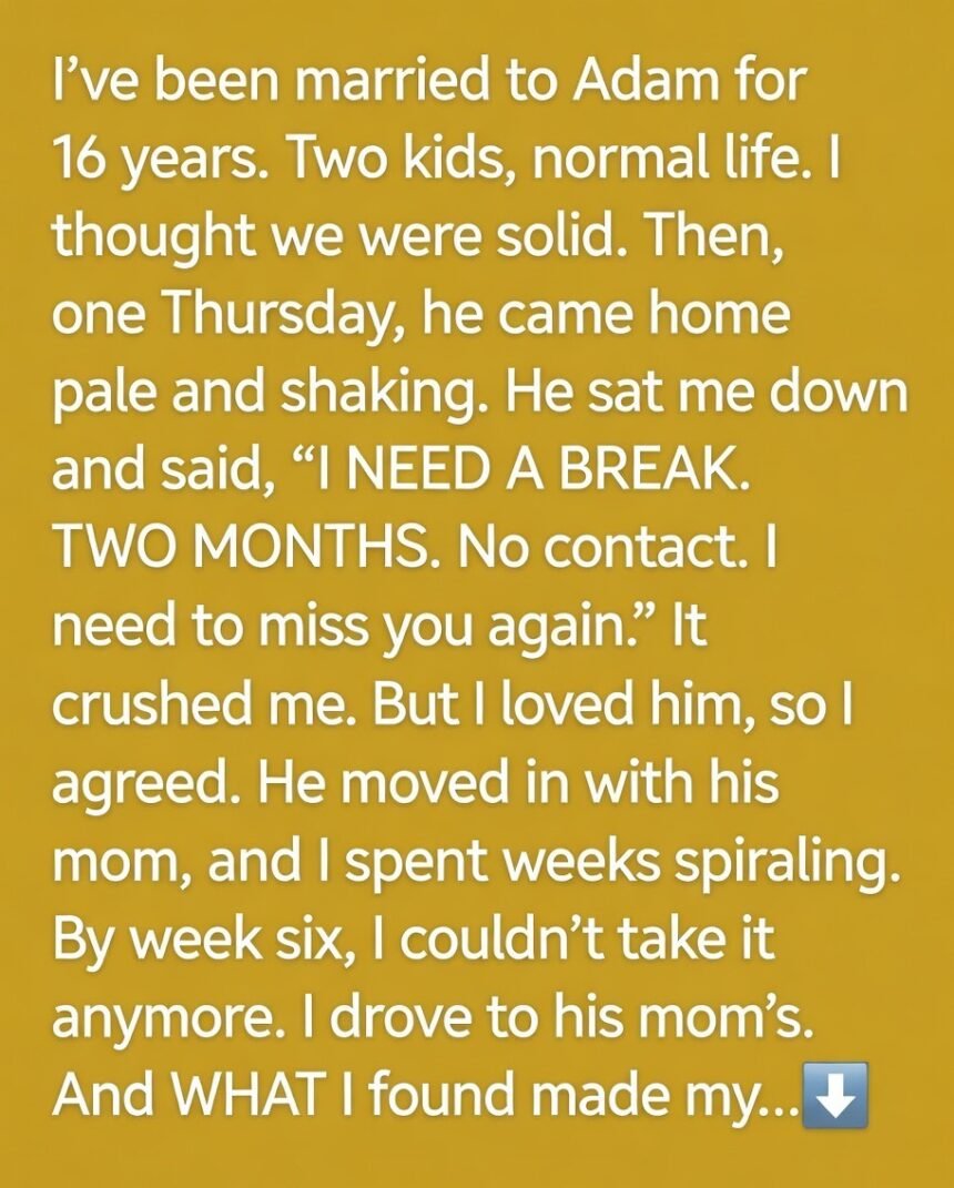 When my husband Adam asked for a two-month break after 16 years of marriage, I was certain another woman was involved. Instead, the truth left me sobbing on the kitchen floor and changed everything I thought I knew about love.I’m Claire, 40, mom to Lily and Max. Our life was ordinary—school runs, movie nights, Adam’s awful dad jokes.