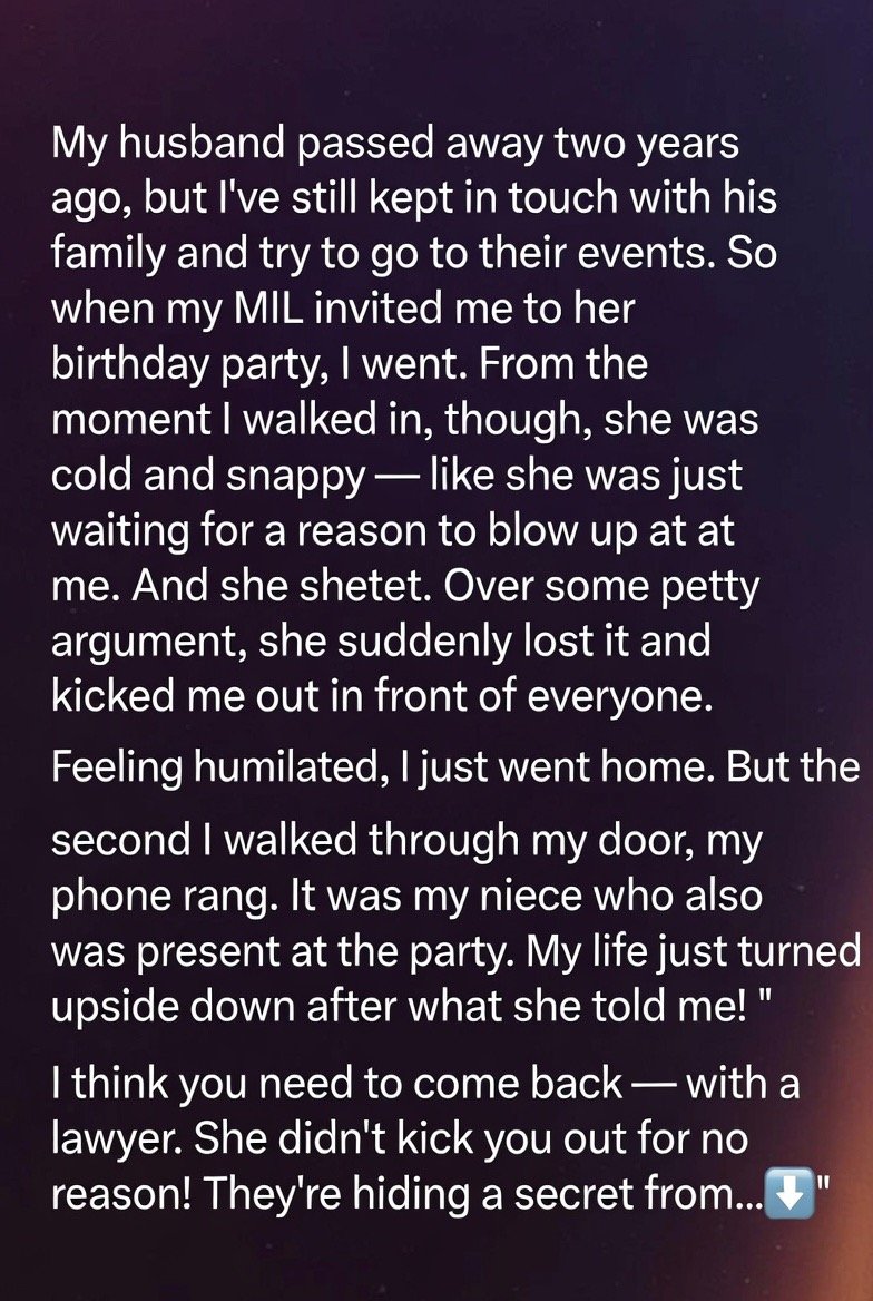 Two years after my husband Mark passed away, I still made an effort to see his family when they invited me. That’s why I was surprised and a little suspicious — when his mother, Kara, sent me an invitation to her birthday party. From the second I stepped inside her home, her smile was tight and her words were laced with judgment.