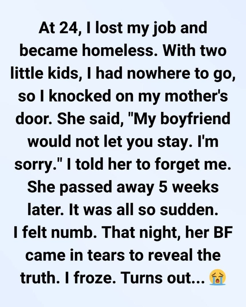 At 24, I lost my job and became homeless. With two little kids, I had nowhere to go, so I swallowed my pride and knocked on my mother’s door. She opened it, looking thinner than I remembered, her eyes tired but still gentle.