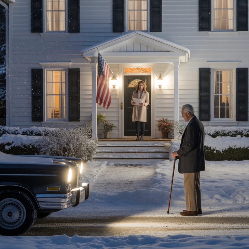 I was still on the porch in the snow when a black town car stopped at the curb. The man everyone swore was dead stepped out with a cane and a ledger. He studied my face like a contract he’d written years ago.