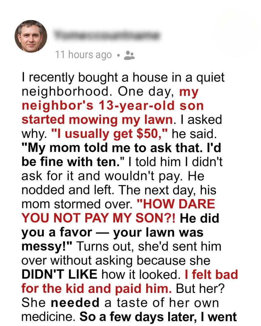Homeownership felt like a dream—until my neighbor decided my lawn was her business. One afternoon, I came home to find her son mowing my yard without permission. When I told him I hadn’t asked for the service, his mom showed up the next morning demanding $50 and accusing me of “taking advantage” of her son.