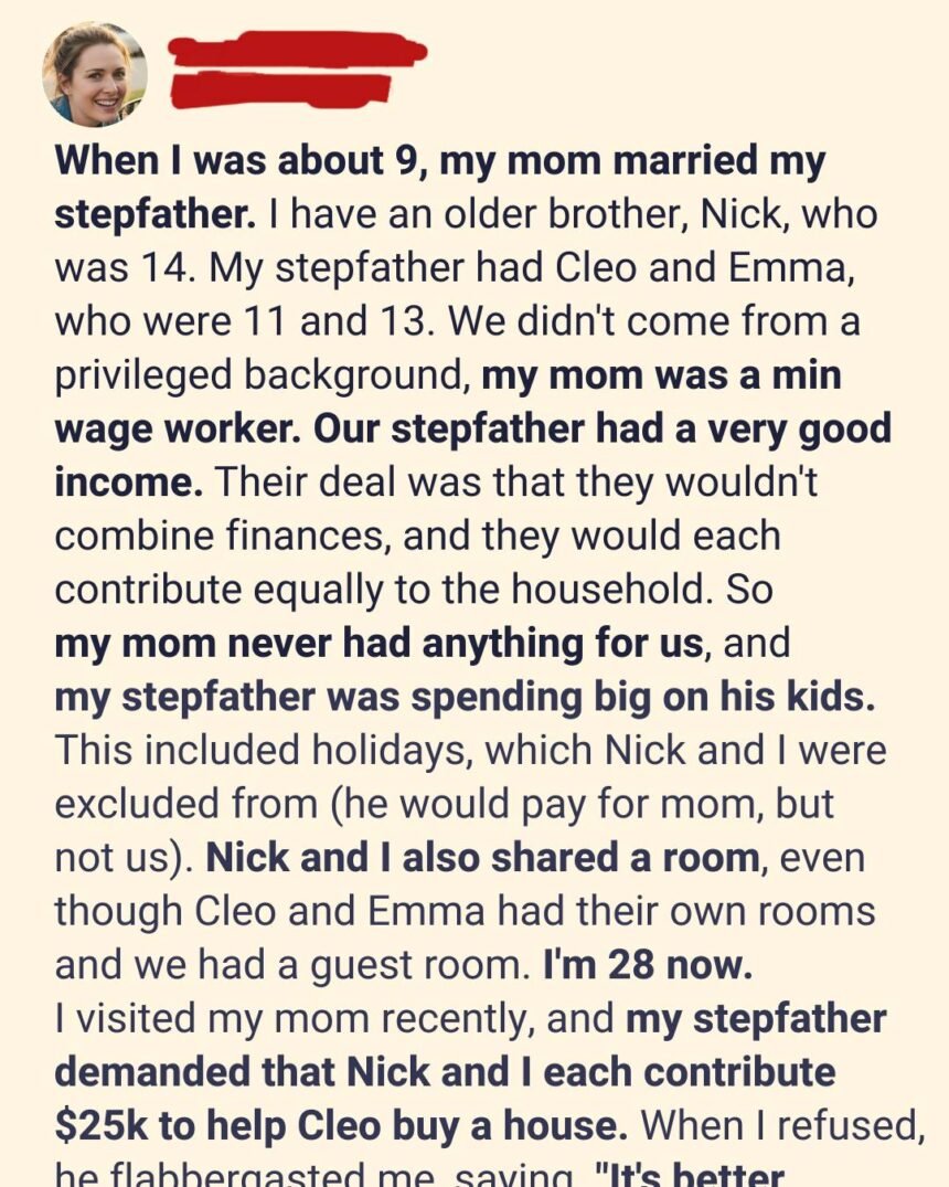Growing up, I watched my stepdad take his daughters on vacations while my brother and I stayed behind. We were never treated as equals. I eventually thought I had left that part of my childhood in the past—until the day he asked me for $25,000 to help his daughter buy a house.
