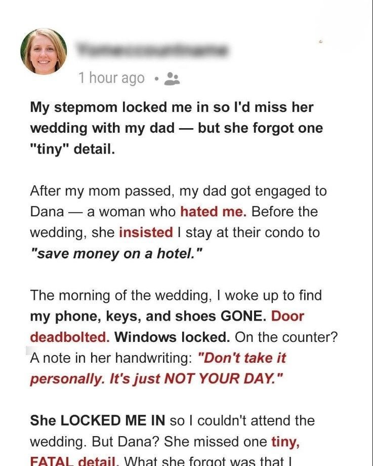 My Stepmother Locked Me In to Stop Me from Going to the Wedding — It Backfired SpectacularlyWhen my dad, 61, announced he was marrying his girlfriend Dana, I kept my doubts to myself. She never liked me, but I showed up anyway—holidays, birthdays, the usual.