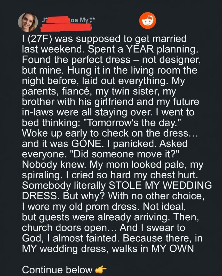 Finding the perfect dress had been the hardest part until she discovered a simple gown that made her feel beautiful. Her mom and family were staying at the house the night before the wedding, including her twin sister, Stacey, who had helped her hang the dress carefully.When the dress disappeared, everyone rushed to help search, but Stacey was nowhere to be found.