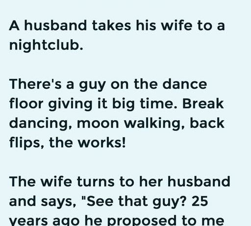 A husband takes his wife to a nightclub. There’s a guy on the dance floor giving it big time. Break dancing, moon walking, back flips, the works!