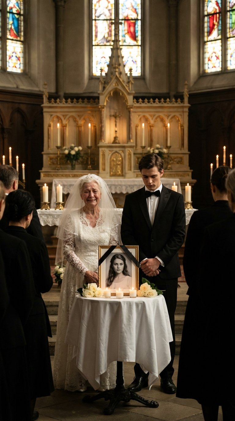 She had been gentle, warm, deeply loved — and the pain of losing her had never really left his face. That pain was impossible to miss now, especially because beside the altar stood a framed photograph of Elena, wrapped in a black ribbon, watching the ceremony like a witness no one could silence.