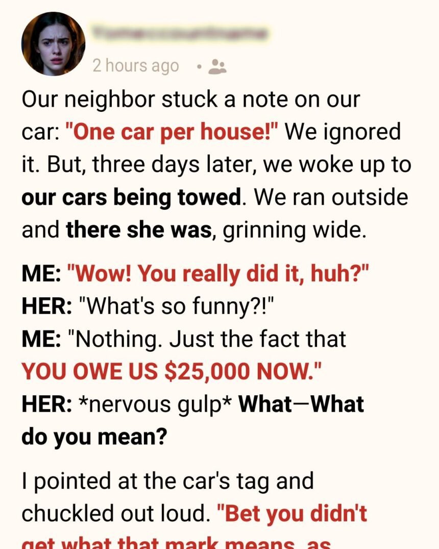 She smiled as our cars were hauled away, convinced she had won some neighborhood battle. But by the next morning, she was standing on her porch in shock, facing a $25,000 mistake she’d never forget. Jack and I had only spent one night in the house.
