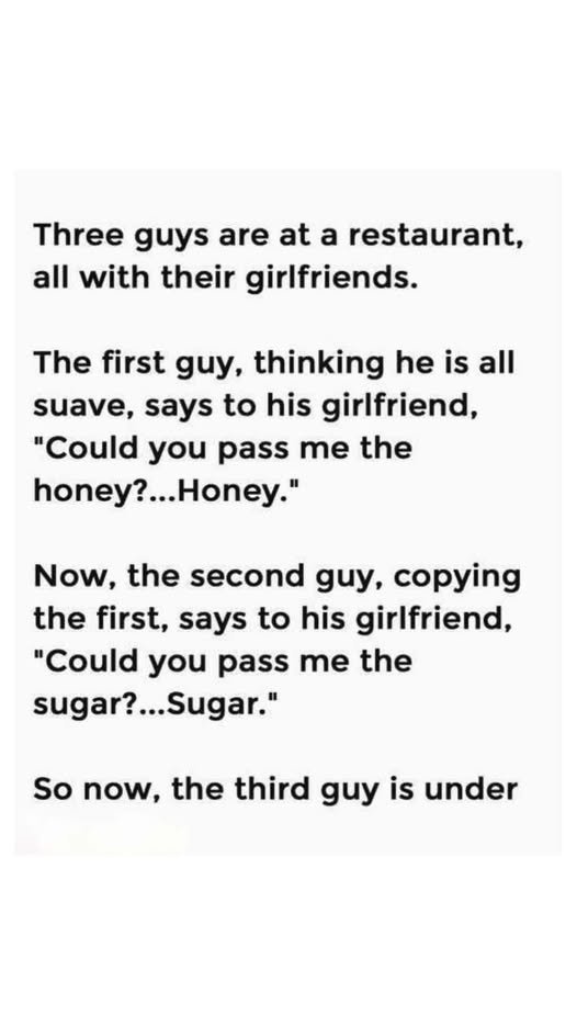Drinks were half-empty, plates nearly cleared, and confidence levels rising steadily. The first man leaned back, flashed a grin he thought was cinematic, and decided it was the perfect moment. “Hey… could you pass me the honey?” he asked.