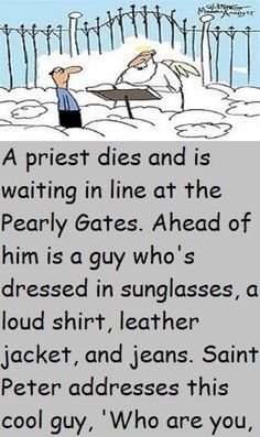 A priest dies and is waiting in line at the Pearly Gates. Ahead of him is a guy who’s dressed in sunglasses, a loud shirt, leather jacket, and jeans. Saint Peter addresses this cool guy,