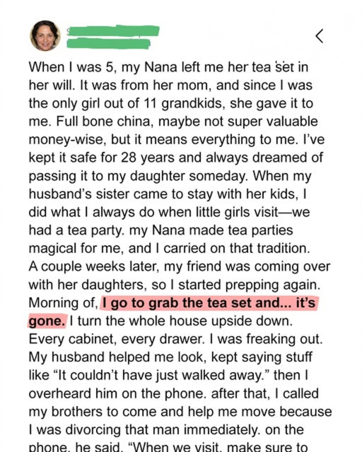 In her new home, she lovingly restores the set and brews a quiet cup of tea—honoring Nana, her past, and the woman she has become. This isn’t just about a tea set. It’s about reclaiming respect, legacy, and finally refusing to apologize for what matters.