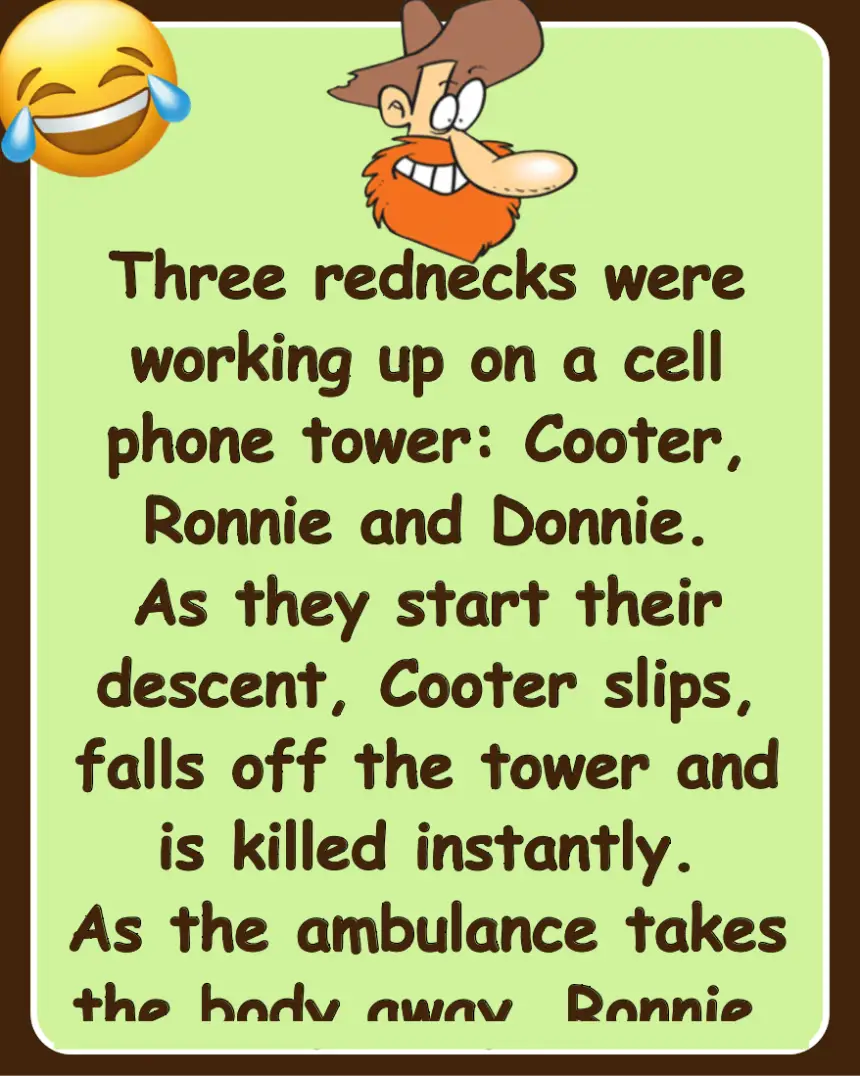 Three rednecks were working up on a cell phone tower: Cooter, Ronnie and Donnie.