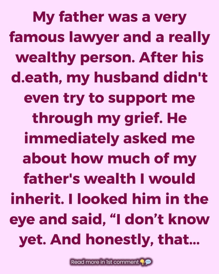 Instead, as soon as we returned home from the funeral, he shut the door, turned to me, and asked—cold as stone—how much of my father’s wealth I would inherit. I stared at him, shocked. This was the man who had promised to love me “for richer, for poorer,” but all he cared about now was the “richer” part.