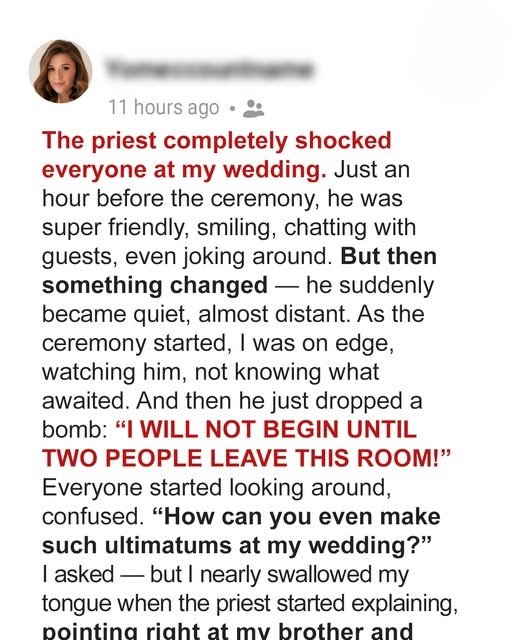 I thought my wedding day would be perfect until the priest refused to start the ceremony. When he pointed at two people in my family and demanded they leave, I couldn’t believe who he was talking about or what he’d overheard them say.