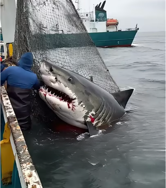 The shark’s dark silhouette moved just below the surface, its dorsal fin slicing through. The team readied the cutters. They knew the dangers: a shark, even one weakened, could lash out; nets under tension could snap with unpredictable force.