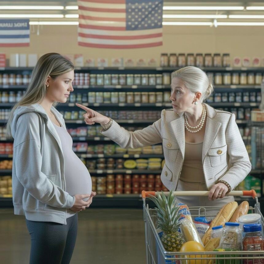Metal slammed into Sarah’s heels, scraping the sensitive skin just above her sneakers. “Ow!” Sarah gasped, stumbling forward. She grabbed the checkout counter to keep from falling, her other hand instinctively flying to her stomach to protect the baby.