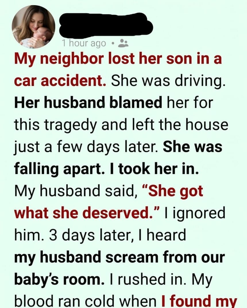 One afternoon, I knocked on her door and asked her to come stay with us. She looked broken, barely able to process the words, but eventually, she nodded through tears. My husband didn’t agree with my decision—he muttered that she “got what she deserved”—but I refused to let her face that kind of pain alone.