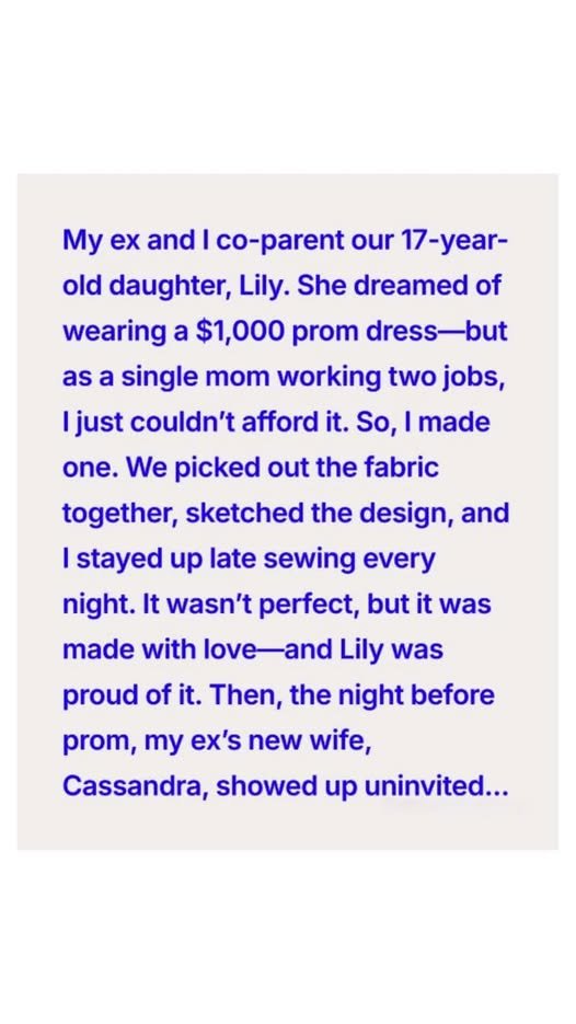 Together we picked fabrics, sketched designs, and I spent nights sewing it stitch by stitch. It wasn’t just a dress—it was proof of love. A day before prom, my ex’s new partner, Cassandra, arrived with the expensive designer dress, trying to show Lily she could “buy” her love.