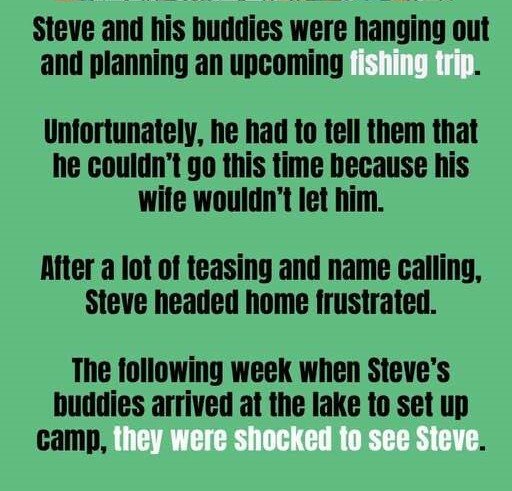 Steve and his buddies were hanging out and planning an upcoming fishing trip. Unfortunately, he had to tell them that he couldn’t go this time because his wife wouldn’t let him. After a lot of teasing and name calling, Steve headed home frustrated.