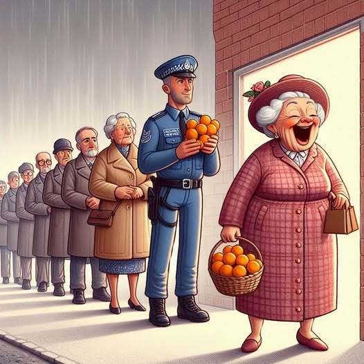 Thinking fast, she whispered, “Gran! It’s a queue for free oranges!”