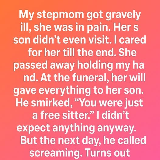 It wasn’t addressed to him—it was addressed to me. In it, she thanked me for caring for her with patience and kindness when she felt most vulnerable. She wrote that while she couldn’t change her will without causing family conflict, she hoped her words would remind me that what I gave her mattered more than anything she could give in return.