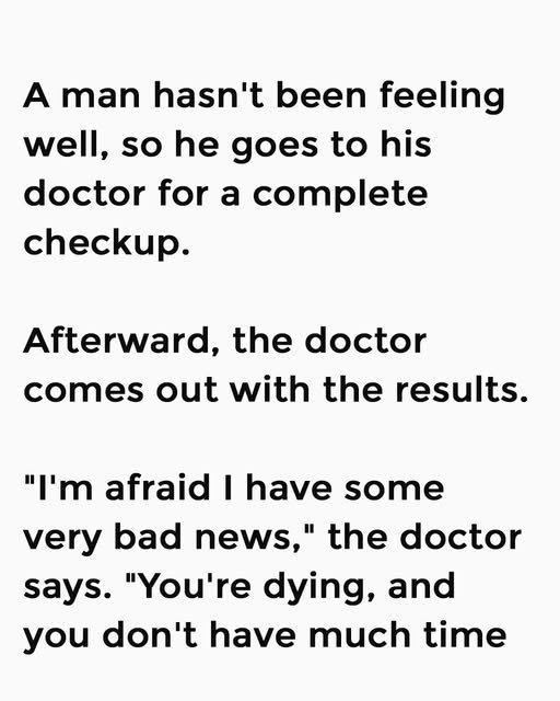A man hasn’t been feeling well, so he goes to his doctor for a complete checkup. Afterward, the doctor comes out with the results. “I’m afraid I have some very bad news,” the doctor says.