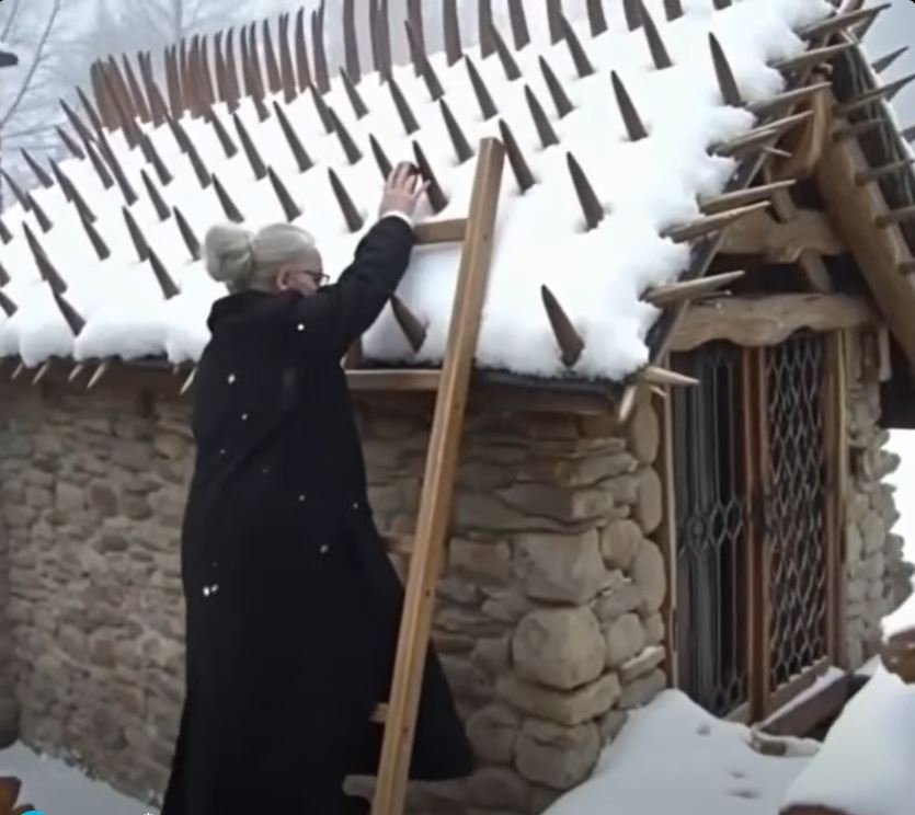 Yet, amid the chaos, one house stood firm. The elderly woman’s home, adorned with its unusual roof of sharp wooden stakes, resisted the storm’s fury. The spikes disrupted the accumulation of snow and ice, directing it off the roof and preventing the crushing weight that had flattened neighboring homes.