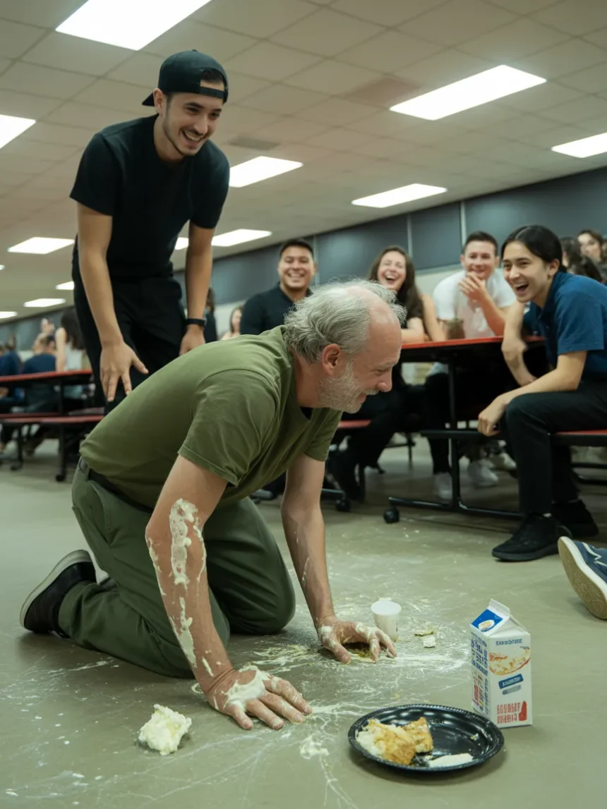 He walked with a slight hitch in his right leg, the legacy of an injury he never fully explained, and his left wrist sometimes stiffened when the weather changed, but he never complained, never asked for sympathy, just adjusted and kept moving like he had been trained to do long before I was born. I was cutting through the cafeteria on my way back from the guidance office when I saw him step into the lunch line, still in his navy-blue maintenance shirt with his name stitched above the pocket, tray balanced carefully in his hands, scanning the menu board like the choices mattered more than they did. For a split second, I considered ducking into the hallway before anyone noticed the connection between us, but hesitation cost me, because at that exact moment his toe caught on the edge of a curled rubber mat near the soda machine, and the stumble that followed unfolded in slow, terrible clarity, the tray tilting, the milk carton bursting, mashed potatoes sliding like wet cement before gravity pulled him down onto one knee, one hand slapping hard against the tile to keep himself from falling completely.