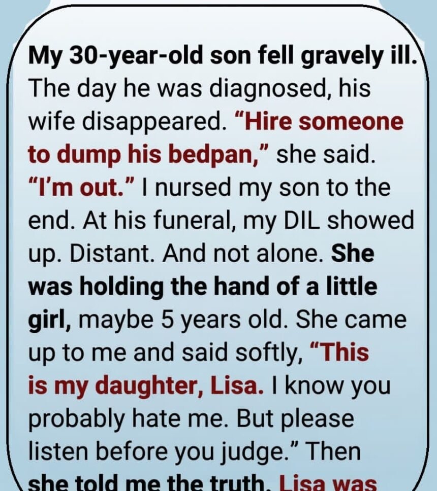 That night, while I was still trying to breathe through the shock, his wife Claire packed her suitcase, refused to meet my eyes, and walked out with cold, cutting words. I moved in the next morning and stayed until the very end, holding my son’s hand as he slipped away, carrying a quiet hatred for the woman who had abandoned him. Six months later, I stood beside his casket, numb from grief, listening to strangers call me strong.