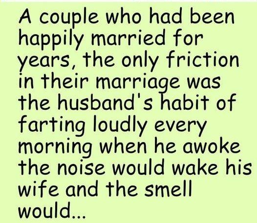 If this story doesn’t make you cry for laughing so hard, let me know and I’ll pray for you. This is a story about a couple who had been happily married for years, the only friction in their marriage was the husband’s habit of farting loudly every morning when he awoke the noise would wake his wife and the smell would make her eyes water, and make her gasp for air. Every morning she would plead with him to stop ripping them off because it was making her sick.