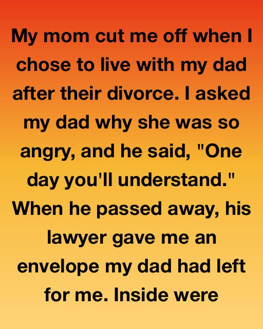 My mom cut me off when I chose to live with my dad after their divorce. I asked my dad why she was so angry, and he said, “One day you’ll understand.” When he passed away, his lawyer gave me an envelope my dad had left for me. Inside were four things: a faded photo of my parents holding a baby I didn’t recognize, a small key, a bank deposit slip, and a handwritten letter.