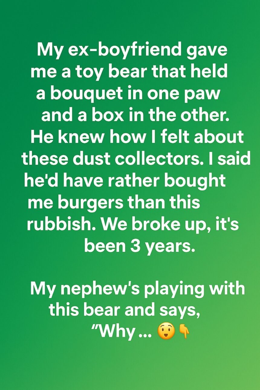We broke up, it’s been 3 years. My nephew’s playing with this bear and says, “Why …“does the bear look like it’s waiting for someone?” His little question caught me off guard. I watched him tilt the bear’s head curiously, as though he sensed a story hidden in its stitched smile.