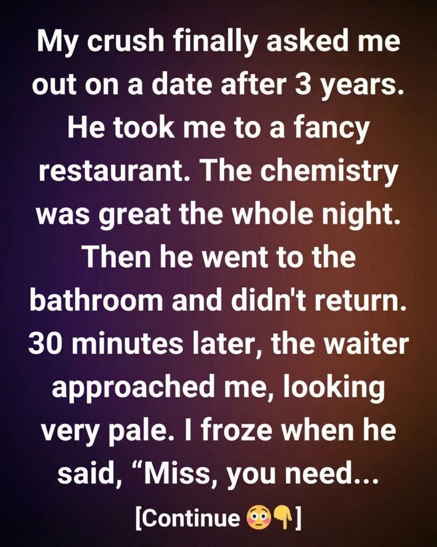 My crush finally asked me out on a date after 3 years.He took me to a fancy restaurant. The chemistry was great the whole night.Then he went to the bathroom and didn’t return. 30 minutes later, the waiter approached me, looking very pale.