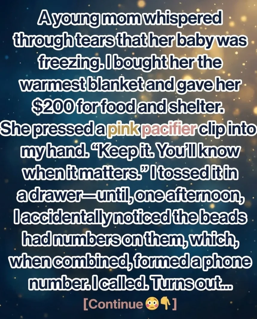 I led her into a nearby shop, bought a thick blanket to warm the baby, and gave her $200—hoping it would help her survive a little longer. Before leaving, she handed me a small pink pacifier clip, asking me to keep it, saying that one day I would understand why. Years passed, and life moved on.