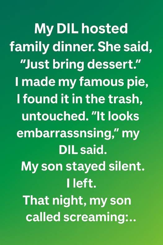My daughter-in-law hosted a beautiful family dinner, warm lights and soft music filling the room. She told me kindly, “Just bring dessert,” so I prepared my favorite pie, the one everyone used to ask for. When I arrived, I placed it proudly on the counter, excited to share.