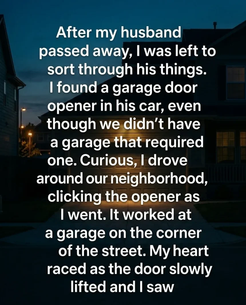 That’s when I came across something that didn’t make sense—a small garage door opener I had never seen before. We didn’t own a garage, and the discovery stirred a quiet unease in me, as if there was a part of his life I had never known. Driven by curiosity and a need for answers, I took a walk around the neighborhood, clutching the device in my hand.