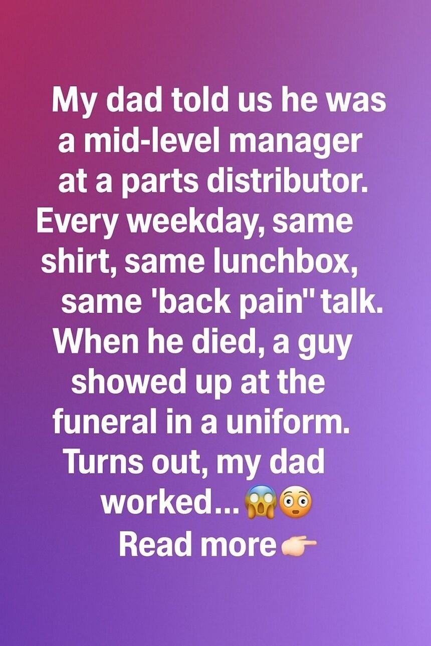 My dad always told us he was a mid-level manager at a parts distributor. Every weekday looked the same—same shirt, same lunchbox, same stories about “back pain from the office.” We never questioned it. But at his funeral, a man in uniform approached us, and everything we thought we knew shifted.