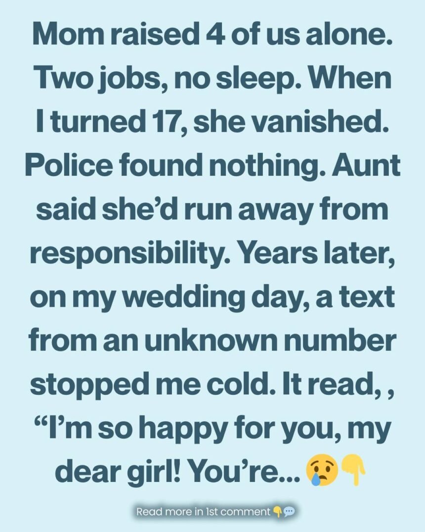 Not willingly. Years later, on my wedding day, while everyone was bustling around me with flowers and makeup brushes, my phone buzzed with a message from an unknown number. I almost ignored it—until I read the words.