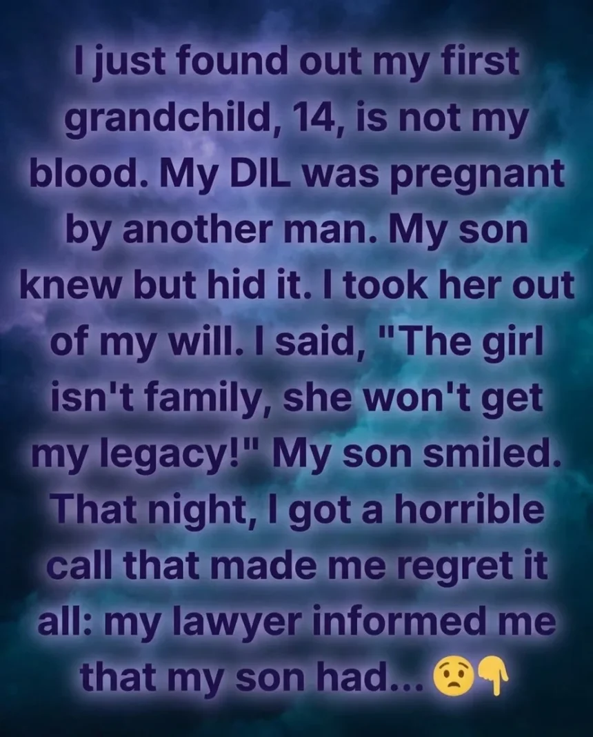 I couldn’t shake the feeling that they would have taken this secret to the grave if I hadn’t discovered it myself. Overcome with anger and hurt, I made a decision I thought was justified at the time — I contacted my lawyer and removed the child from my will, declaring she was not truly part of my family. When I told my son, I expected an argument, maybe even an apology.