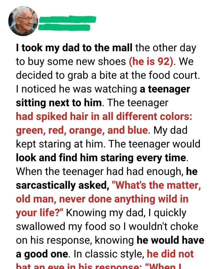 Naturally, my dad couldn’t look away. He wasn’t staring with judgment — just quiet fascination, the kind you see from someone who has lived long enough to watch the world change in remarkable and unexpected ways. I noticed the boy shifting in his seat, stealing uncertain glances at my dad, clearly confused as to why this elderly man kept watching him.