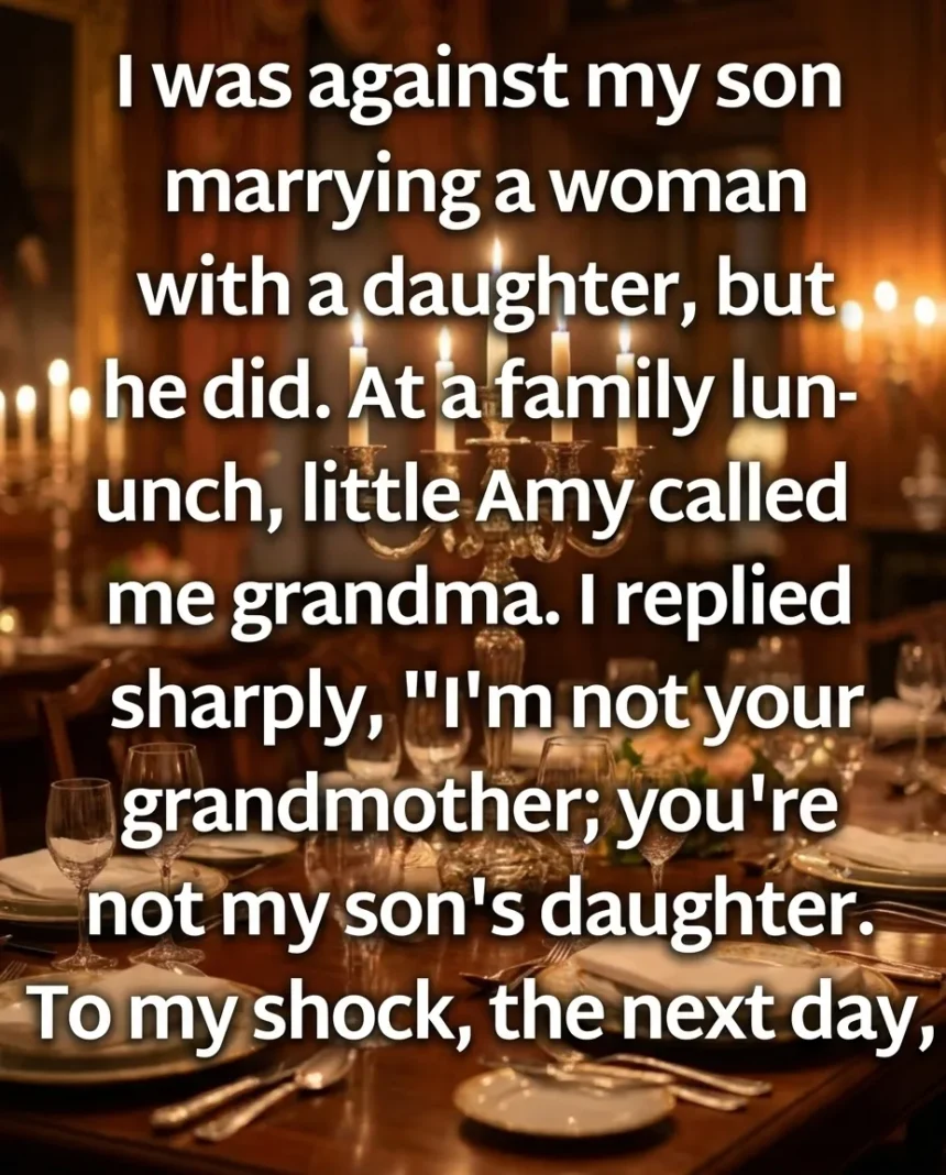 Before I could stop myself, I replied coldly, “I’m not your grandmother.” The words fell into the room like glass shattering, and the cheerful noise around the table disappeared instantly. Amy’s smile faded, not dramatically, but with the quiet confusion only a child can show when they realize they’ve done something wrong without knowing why. She hadn’t demanded anything from me—she had simply offered affection, and I had rejected it.