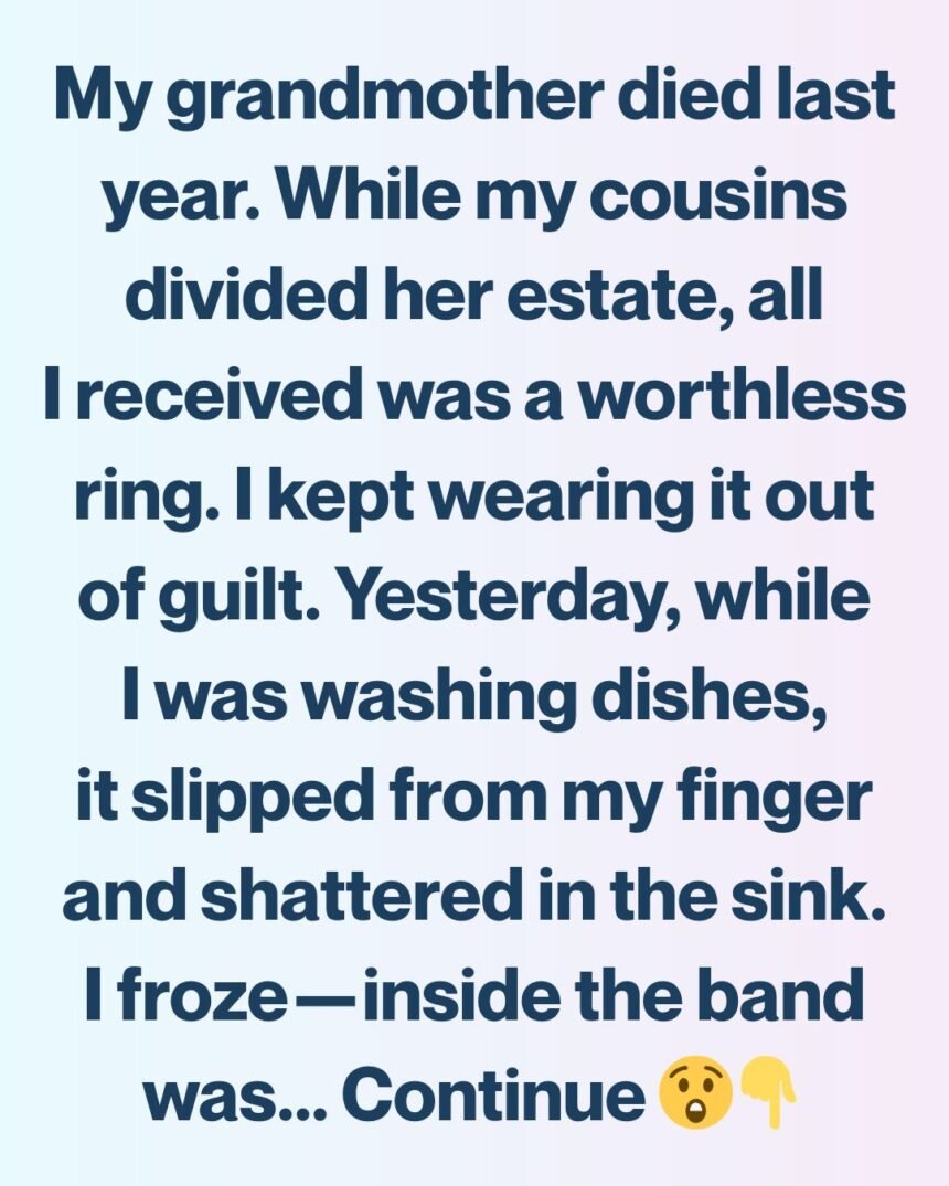 I wondered if she had expected me to want more—if I should have fought for some part of her legacy. Yesterday, while washing dishes after dinner, my hands were slick with soap when the ring suddenly slid off. I heard it hit the stainless-steel sink with a sharp clink, followed by a sound that made me gasp—a small crack, almost like glass breaking.