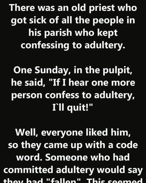 There was an old priest who got sick of all the people in his parish who kept confessing to adultery. One Sunday, in the pulpit, he said, “If I hear one more person confess to adultery, I`ll quit!”