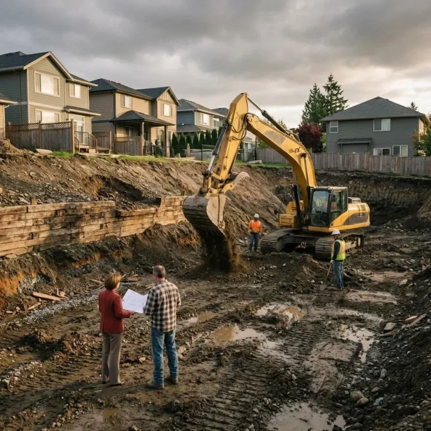 Behind it sat somewhere around a hundred and eighty cubic yards of compacted soil. That wall was not decoration. It was the only thing stopping the hill from paying the neighbors a visit.
