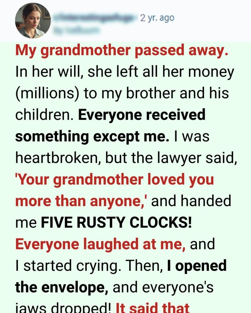 My brother snorted under his breath. The lawyer reached under the table and lifted a dusty box. Inside were five rusty clocks.