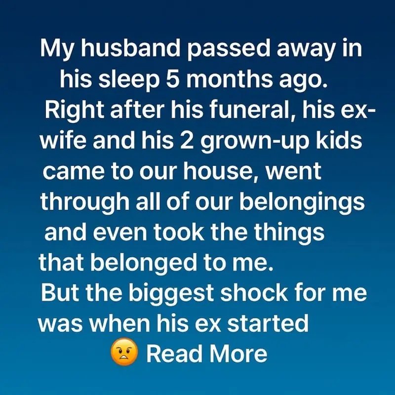 After the funeral, I expected space to grieve, but instead I was met with a storm. His ex-wife and his two grown-up children showed up at my house. At first, I thought they came to offer comfort, but within hours, they were opening drawers, taking clothes, and arguing about what “belonged to the family.” They even carried away things that were mine—gifts my husband had given me, letters we had exchanged, little pieces of our love story.
