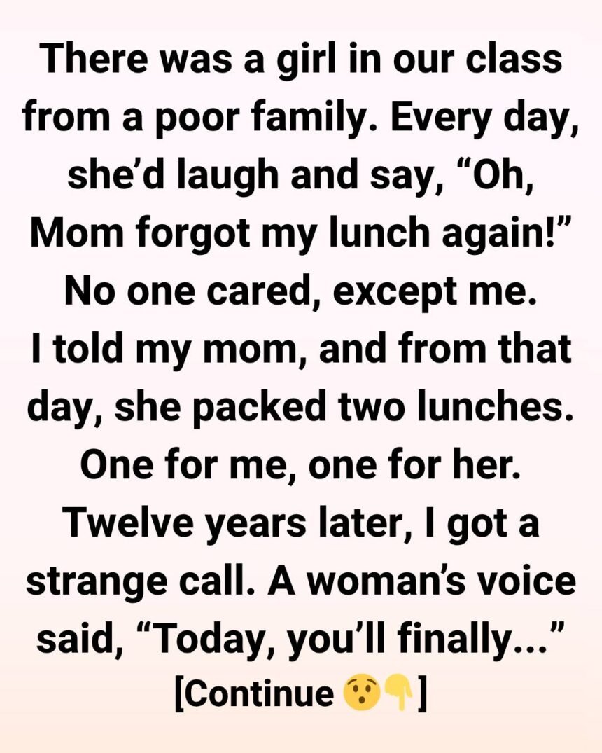 There was a girl in our class from a poor family. Every day, she’d laugh and say, “Oh, Mom forgot my lunch again!” No one cared, except me. I told my mom, and from that day, she packed two lunches.